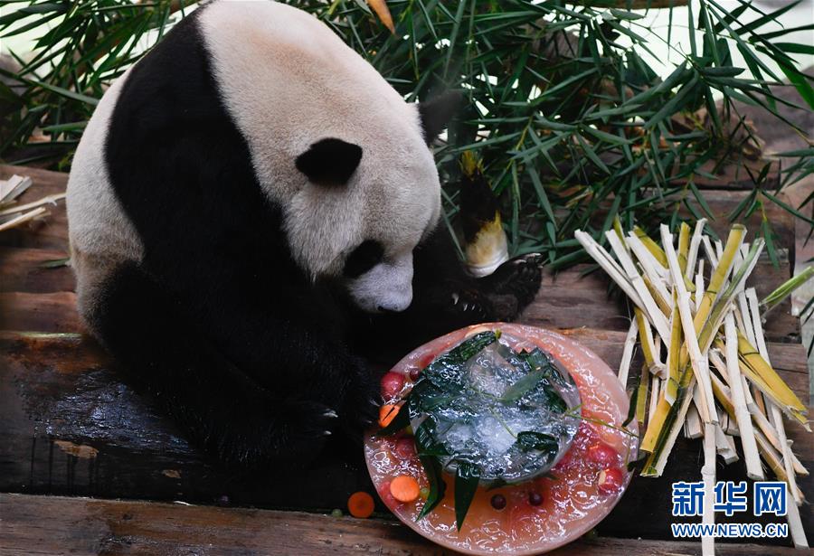 4月28日,在海南热带野生动植物园,大熊猫“舜舜”在享用冰蛋糕。 新华社记者 杨冠宇 摄