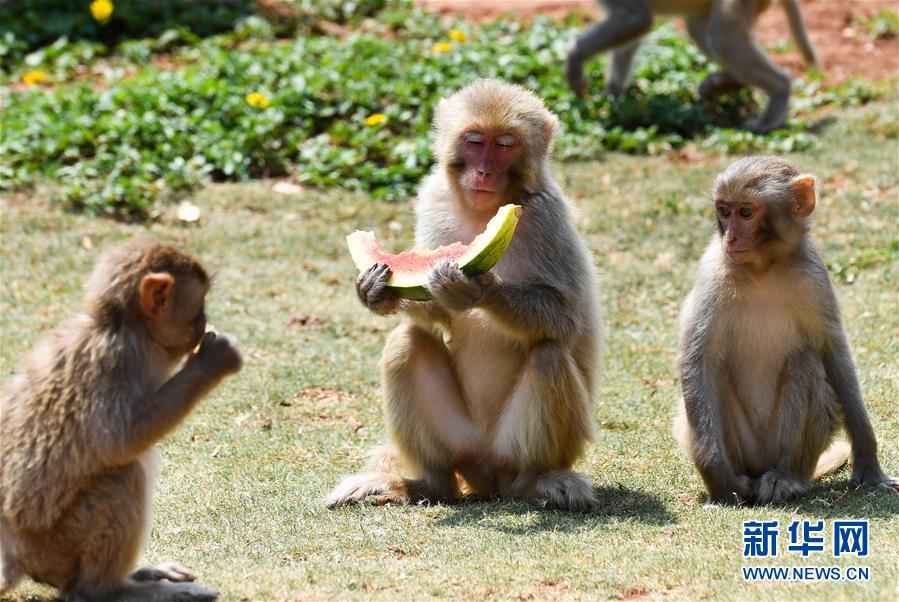 4月28日,在海南热带野生动植物园,猕猴在吃西瓜。 新华社记者 杨冠宇 摄