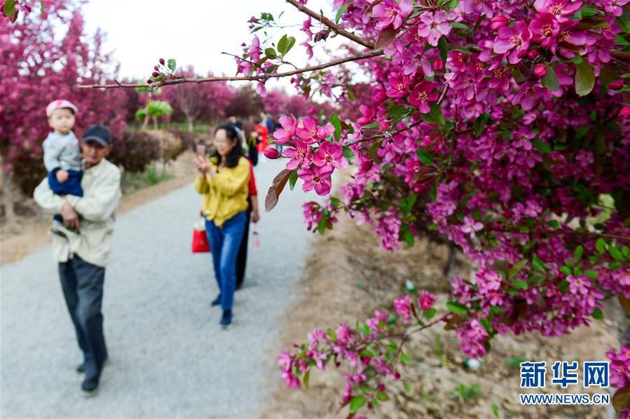 呼图壁县二十里店镇北美海棠园内的海棠花盛开(4月28日摄)。当日,正在新疆昌吉回族自治州呼图壁县举行的第四届海棠花季乡村文化旅游节吸引了众多游客。目前,新疆天山北麓海棠花相继绽放,进入最佳观赏期。 新华社发(丁磊摄)