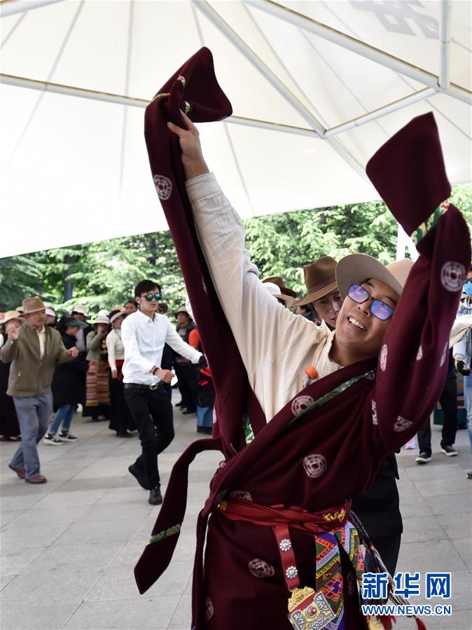 5月6日,人们在布达拉宫脚下的龙王潭公园跳舞。 当日是二十四节气中的立夏,拉萨阳光明媚,气候宜人,人们纷纷走到户外享受阳光。 新华社记者 觉果 摄