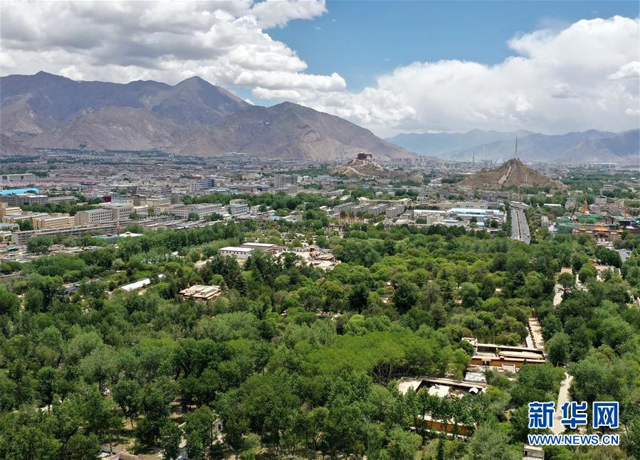 5月20日,空中鸟瞰罗布林卡(无人机拍摄)。 位于拉萨西郊的罗布林卡,藏语意为“宝贝园林”,占地36公顷。进入初夏,上万盆鲜花装点着罗布林卡,道路两旁花团锦簇,绿树成荫,美不胜收。 新华社记者 普布扎西摄