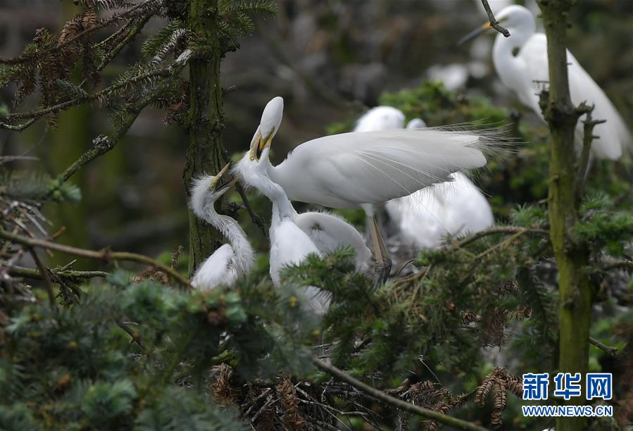 在江西省南昌市新建区象山森林公园内,白鹭和自己的雏鸟在一起(5月21日摄)。 近日,在江西省南昌市新建区象山森林公园内,已安家筑巢的大批鹭鸟陆续孵化出了后代。象山森林公园有着“鹭鸟王国”的美誉,生态环境良好,每年都会吸引白鹭、苍鹭、夜鹭等种类的鹭鸟飞抵栖息和繁衍后代。 新华社记者 彭昭之 摄
