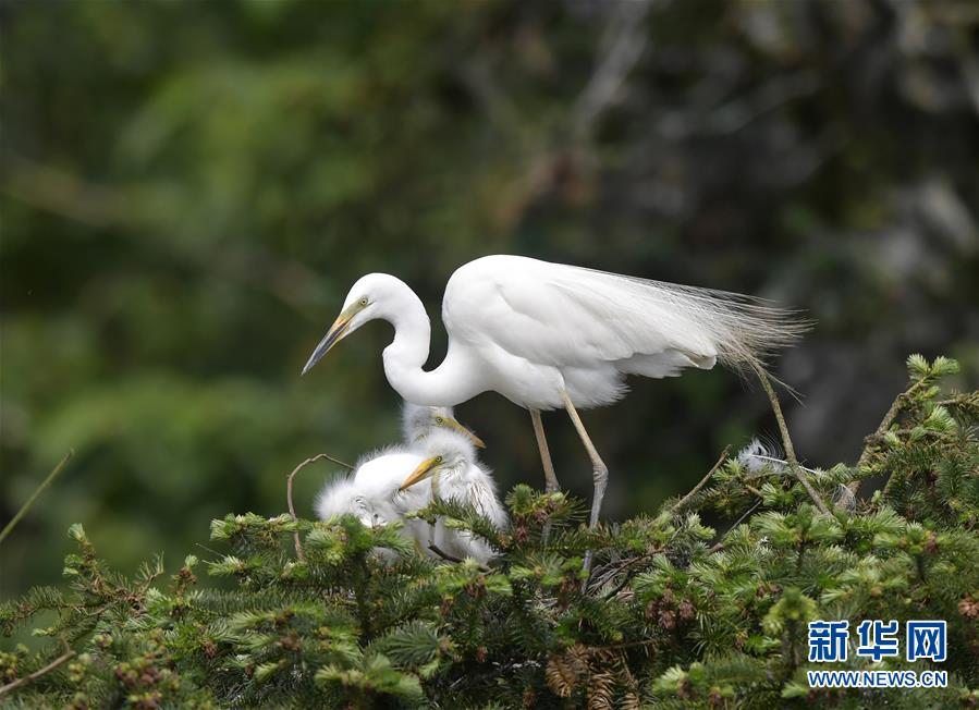 在江西省南昌市新建区象山森林公园内,白鹭和自己的雏鸟在一起(5月21日摄)。 近日,在江西省南昌市新建区象山森林公园内,已安家筑巢的大批鹭鸟陆续孵化出了后代。象山森林公园有着“鹭鸟王国”的美誉,生态环境良好,每年都会吸引白鹭、苍鹭、夜鹭等种类的鹭鸟飞抵栖息和繁衍后代。 新华社记者 彭昭之 摄