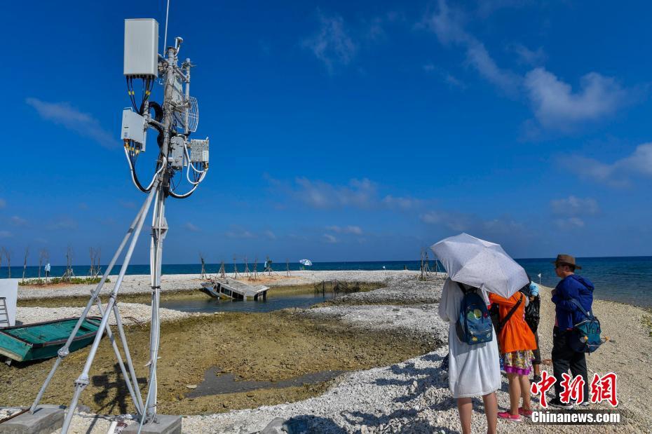 近日,搭乘“长乐公主”邮轮前往西沙旅游的游客,登上西沙鸭公岛游览。鸭公岛面积约0.01平方公里,全岛没有一粒沙子,全部由细小零碎的珊瑚礁石和贝克堆砌而成,岛中央有一个随海潮涨落的泻湖。图为鸭公岛上已搭建了4G移动网络基站。骆云飞 摄