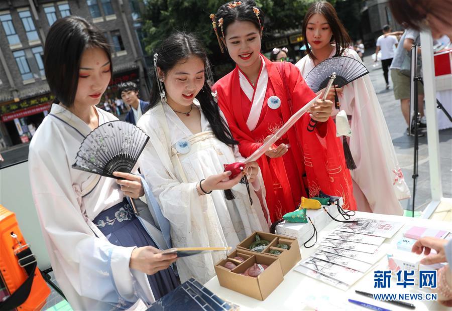 6月9日,在成都宽窄巷子,几位汉服爱好者在香包、茶器等展台驻足。新华社记者 江宏景 摄
