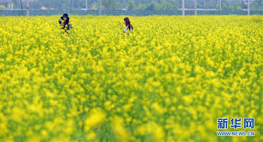 6月11日,游客在油菜花海里游玩。 近日,在辽宁省沈阳市沈北新区时空东街与蒲民北路交叉口附近,成片的油菜花竞相绽放,吸引众多游客前来观赏。 新华社记者 杨青 摄
