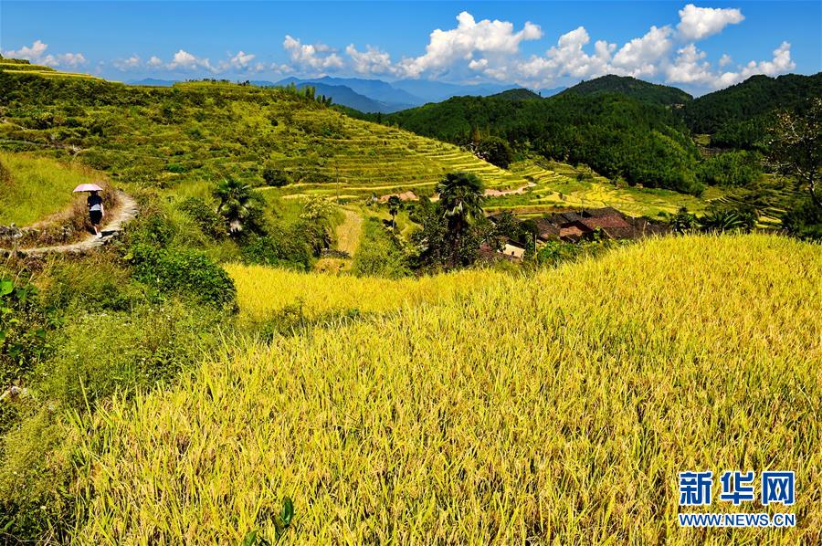 游人走在福建武夷山市吴屯乡后源村千亩梯田的小路上(2018年9月20日摄)。新华社记者 张国俊 摄