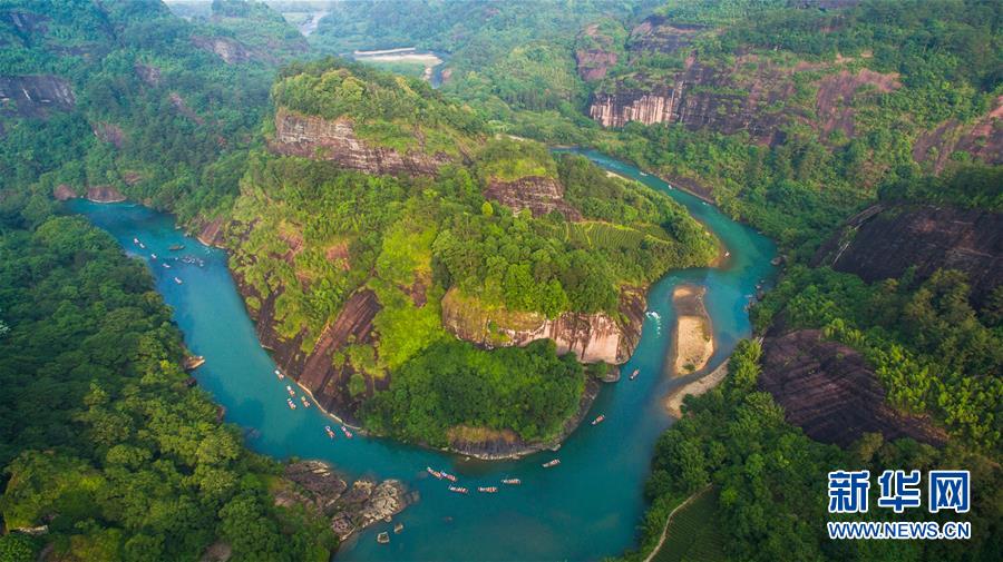 游客乘竹筏在福建武夷山九曲溪游览(5月21日无人机拍摄)。 新华社记者 宋为伟 摄