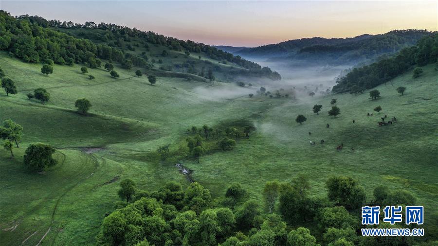 6月13日无人机拍摄的关山草原景色。 关山草原位于陕西省陇县境内,这里风光优美,有森林、草原、河流、峡谷等自然景观。夏日里的关山草原气候凉爽,草原上各色野花盛开,成为人们避暑度假的好去处。 新华社记者 陶明 摄