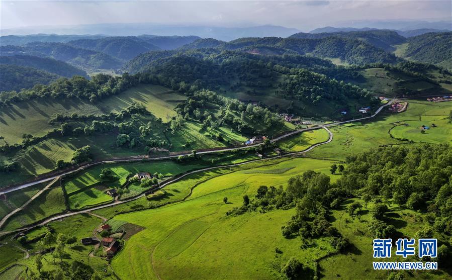 6月12日无人机拍摄的关山草原景色。 关山草原位于陕西省陇县境内,这里风光优美,有森林、草原、河流、峡谷等自然景观。夏日里的关山草原气候凉爽,草原上各色野花盛开,成为人们避暑度假的好去处。 新华社记者 陶明 摄