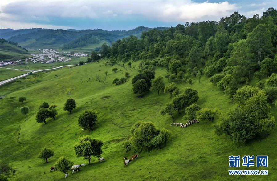 6月12日无人机拍摄的关山草原景色。 关山草原位于陕西省陇县境内,这里风光优美,有森林、草原、河流、峡谷等自然景观。夏日里的关山草原气候凉爽,草原上各色野花盛开,成为人们避暑度假的好去处。 新华社记者 陶明 摄
