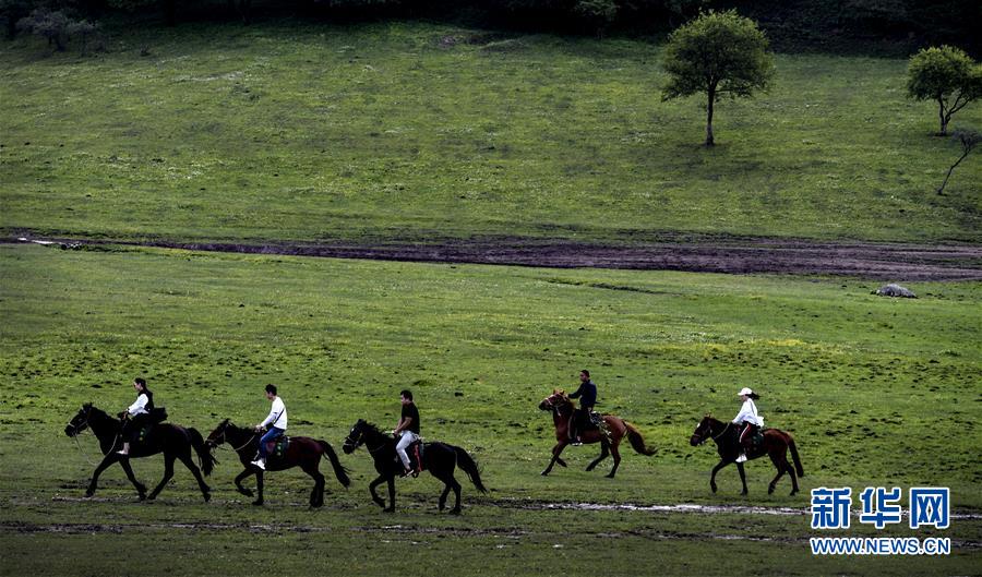 6月12日,游人在关山草原上骑马休闲。 关山草原位于陕西省陇县境内,这里风光优美,有森林、草原、河流、峡谷等自然景观。夏日里的关山草原气候凉爽,草原上各色野花盛开,成为人们避暑度假的好去处。 新华社记者 陶明 摄