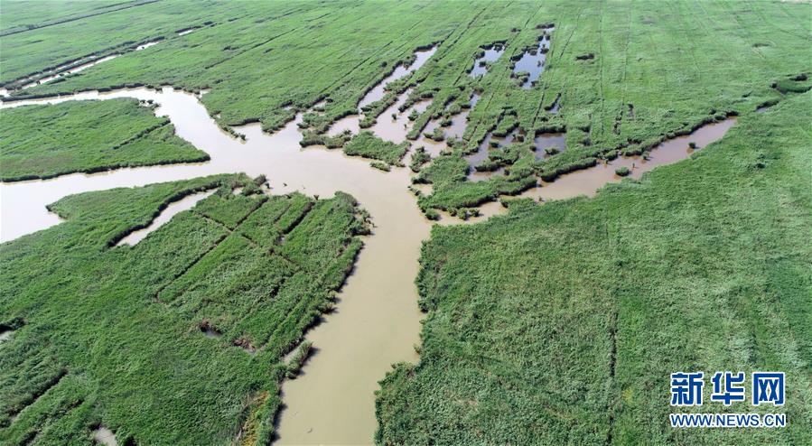 这是天津市宁河区七里海湿地内芦苇和水面形成的图案(6月22日无人机拍摄)。新华社记者 岳月伟 摄