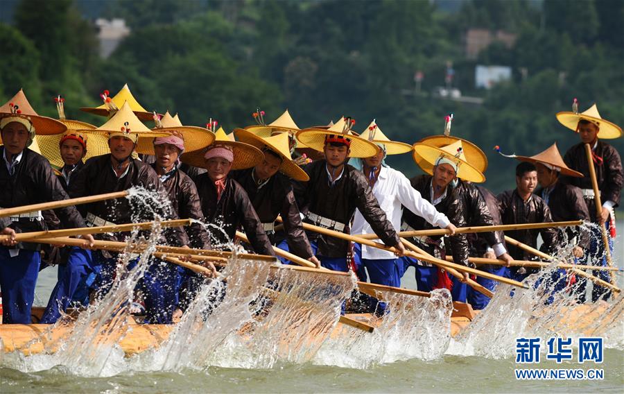 6月27日,苗族群众在贵州省台江县施洞镇清水江上赛独木龙舟。 新华社记者 杨文斌 摄