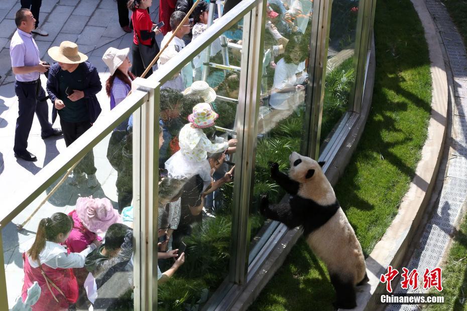 6月30日,“2016级”大熊猫“奇果”和“园满”在青海西宁迎来3岁生日,这也是大熊猫“落户”青藏高原后的首个生日。大熊猫“奇果”和“园满”来自成都大熊猫繁育研究基地,于本月初“入驻”位于青海西宁青藏高原野生动物园内的熊猫馆,系两只亚成年大熊猫“小公主”,分别出生于2016年7月1日和2016年6月29日。图为大熊猫“奇果”与游客“互动”。 中新社记者 罗云鹏 摄