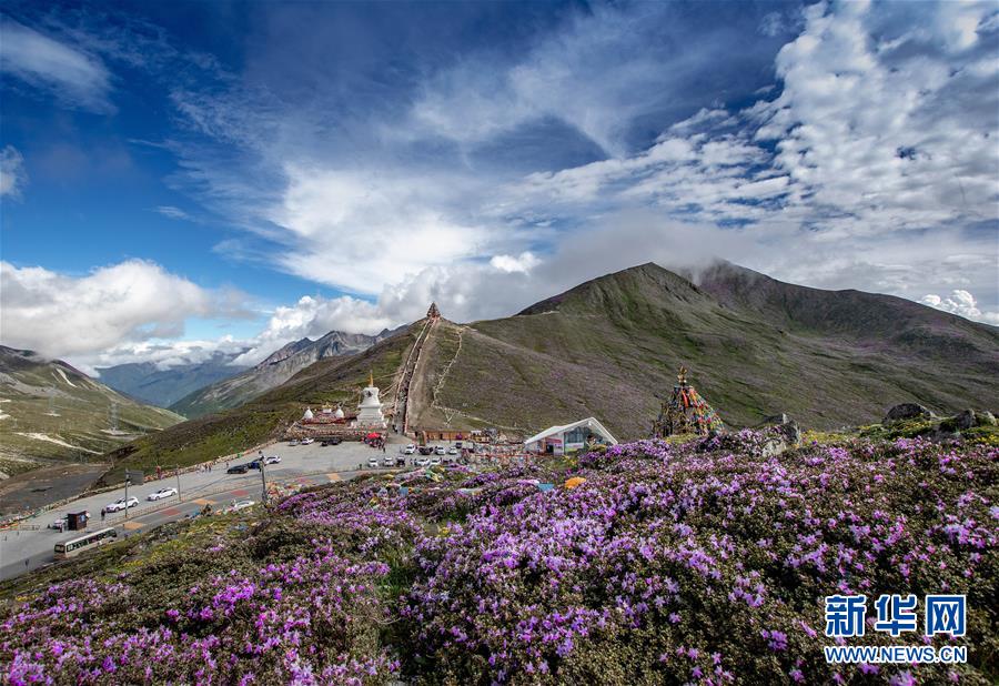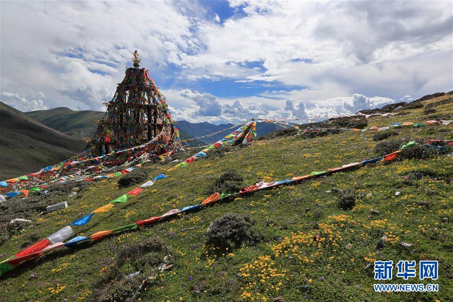 在川藏公路四川折多山垭口,蓝天白云与经幡、草地、鲜花构成一幅美丽画卷(6月28日摄)。 新华社记者 江宏景 摄