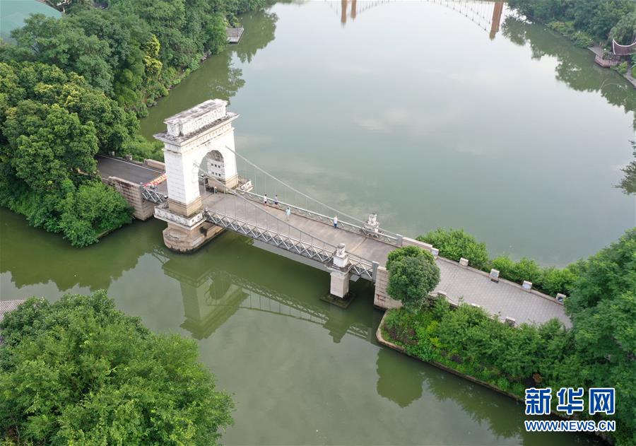 桂林市榕湖上的桥梁(7月1日无人机拍摄)。 夏日时节,广西桂林市区内的榕湖、杉湖、桂湖、木龙湖等地绿树成荫、景色迷人。 新华社记者陆波岸摄
