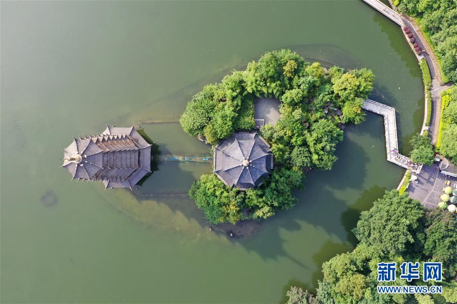 桂林市杉湖景观(7月1日无人机拍摄)。 夏日时节,广西桂林市区内的榕湖、杉湖、桂湖、木龙湖等地绿树成荫、景色迷人。 新华社记者陆波岸摄