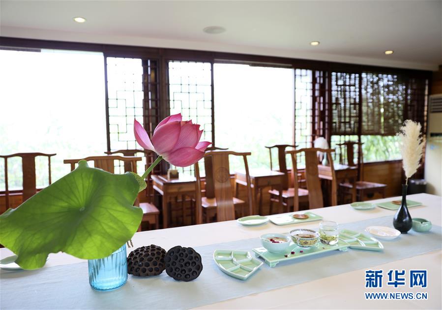 7月2日在下渚湖一处游客休息区拍摄的带有德清地方风味的“三道茶”——甜茶(中间左一茶碗)、咸茶(中间左二茶碗)和清茶(中间右一茶杯)。 新华社记者 兰红光 摄