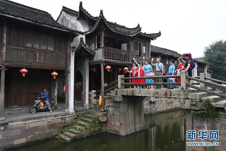 7月4日,游客在新市古镇一座石桥上留影。 新市古镇位于浙江省德清县,建筑风貌完整、市井气息浓厚,是江南水乡古镇的典型代表。炎炎夏日,古镇绿水环绕,绿树成荫,吸引众多游客。 新华社记者 姜克红 摄