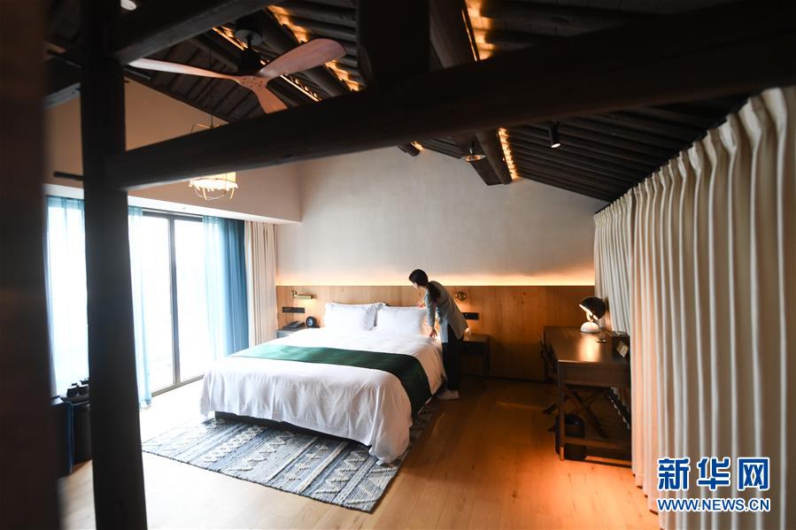 7月4日,在新市古镇一座由传统建筑改造的民宿,工作人员整理房间。 新市古镇位于浙江省德清县,建筑风貌完整、市井气息浓厚,是江南水乡古镇的典型代表。炎炎夏日,古镇绿水环绕,绿树成荫,吸引众多游客。 新华社记者 李嘉南 摄