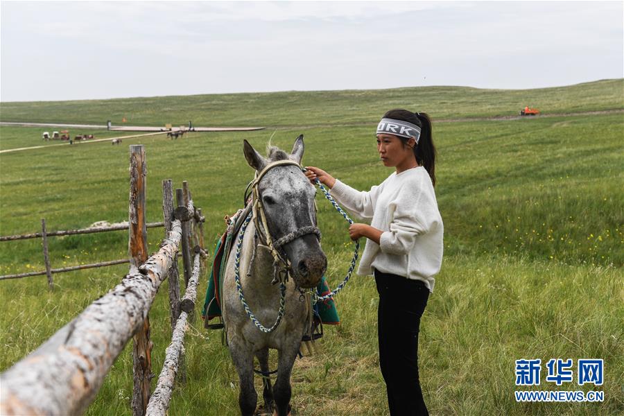 8月5日,在内蒙古自治区乌拉盖草原一处景点,阿斯如在照料马匹。新华社记者 刘磊 摄