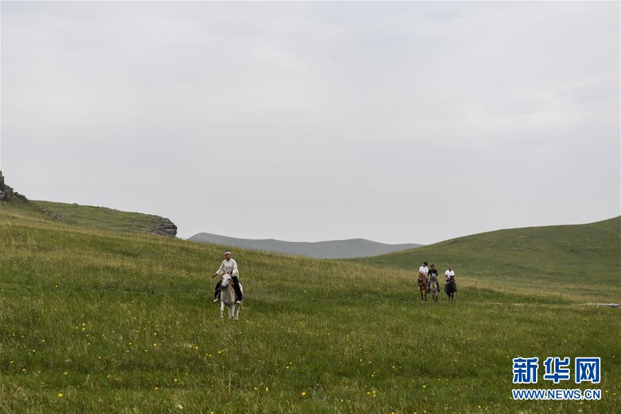 8月5日,在内蒙古自治区乌拉盖草原一处景点,阿斯如(前)领着游客骑马。新华社记者 刘磊 摄