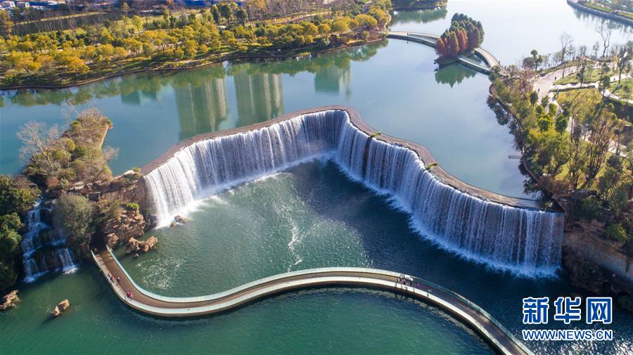 云南昆明瀑布公园一景(1月5日无人机拍摄)。 新华社记者胡超摄