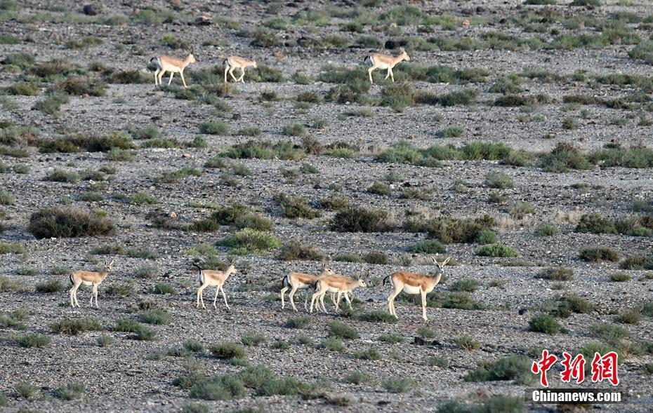 近日,新疆和静北山公园附近,出现40多只鹅喉结队慢悠悠地羚觅食。鹅喉羚属于国家二级保护动物,栖息于海拔2000~3000米的高原开阔地,经常几只到十几只集成小群活动,耐旱性强,鹅喉羚依靠生长在荒漠上的红柳、梭梭草、骆驼刺等草类为食。近年来,由于和静县加大生态治理,尤其是北山绿化工程,生态环境逐年改善,野生动物数量大幅增长,为鹅喉羚等野生动物营造了安定的繁衍栖息场所。肖永浩 摄