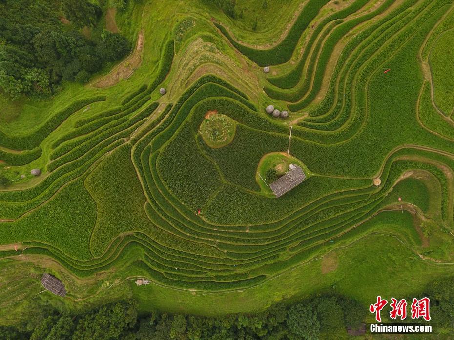8月14日,航拍贵州省榕江县计划村梯田。近日,贵州省黔东南苗族侗族自治州榕江县月亮山地区的稻田禾苗返青,层层叠叠的梯田绿意盎然,宛如画卷。 中新社记者 贺俊怡 摄