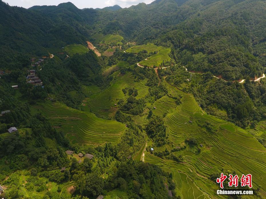 8月14日,航拍贵州省榕江县计划村梯田。近日,贵州省黔东南苗族侗族自治州榕江县月亮山地区的稻田禾苗返青,层层叠叠的梯田绿意盎然,宛如画卷。 中新社记者 贺俊怡 摄