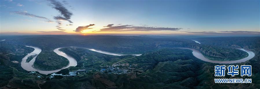 这是8月14日无人机拍摄的朝霞下的黄河乾坤湾景色。 新华社记者 陶明 摄