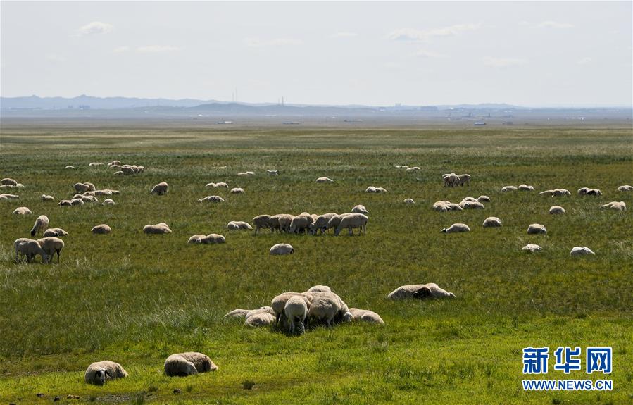 这是8月14日拍摄的锡林郭勒盟东乌珠穆沁旗境内草原上的羊群。 立秋过后,内蒙古锡林郭勒盟东乌珠穆沁旗境内的草原展现出独特的壮阔之美。 新华社记者 彭源 摄
