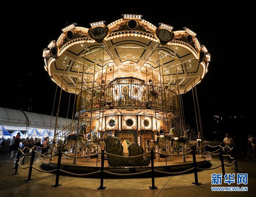 8月10日,在泰国曼谷河滨夜市,儿童在乘坐旋转木马。 夜幕之下,多姿多彩的夜生活让曼谷这座城市充满活力。 新华社记者 张可任 摄