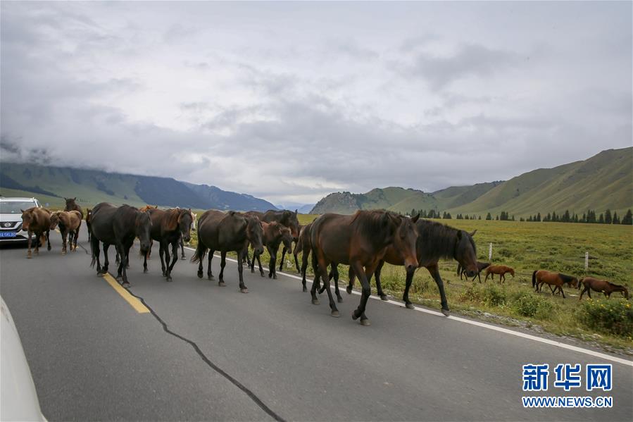 马群在独库公路上“悠闲”漫步(8月17日摄)。 新疆独库公路为国道217线独山子——库车段,纵贯天山南北,串联冰川、湖泊、森林、草原等多种景观形态,牧民毡房遍布沿线,牛羊散落在高低起伏的草场上,兼具自然与人文之美,成为自驾游客、骑行徒步爱好者在新疆旅游的热门线路之一。 近日,阴雨绵绵,天山山脉被云雾环绕,独库公路展现出不一样的美,令游客流连忘返。 新华社记者 李鹏 摄
