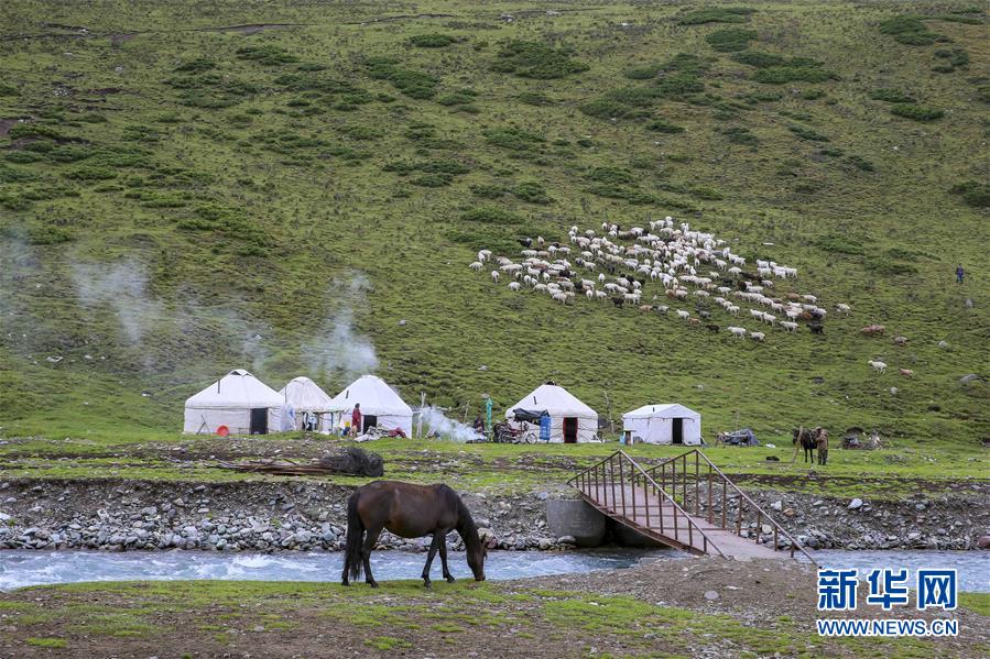 独库公路旁的一处牧场(8月17日摄)。 新疆独库公路为国道217线独山子——库车段,纵贯天山南北,串联冰川、湖泊、森林、草原等多种景观形态,牧民毡房遍布沿线,牛羊散落在高低起伏的草场上,兼具自然与人文之美,成为自驾游客、骑行徒步爱好者在新疆旅游的热门线路之一。 近日,阴雨绵绵,天山山脉被云雾环绕,独库公路展现出不一样的美,令游客流连忘返。 新华社记者 李鹏 摄