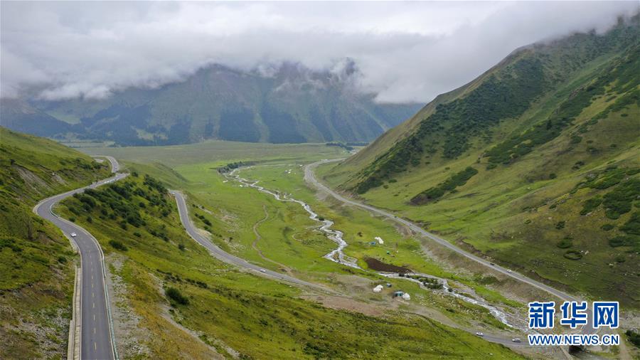 车辆行驶在独库公路上(8月17日无人机拍摄)。 新疆独库公路为国道217线独山子——库车段,纵贯天山南北,串联冰川、湖泊、森林、草原等多种景观形态,牧民毡房遍布沿线,牛羊散落在高低起伏的草场上,兼具自然与人文之美,成为自驾游客、骑行徒步爱好者在新疆旅游的热门线路之一。 近日,阴雨绵绵,天山山脉被云雾环绕,独库公路展现出不一样的美,令游客流连忘返。 新华社记者 胡虎虎 摄