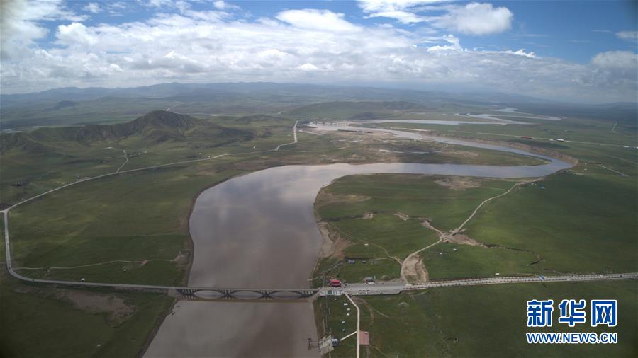 在甘肃玛曲拍摄的黄河和玛曲黄河大桥(8月24日无人机拍摄)。新华社记者 刘诗平 摄