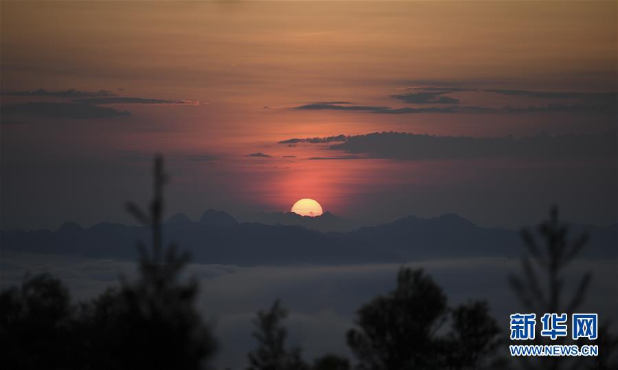 这是在摩天岭上拍摄的日出(8月29日摄)。 8月29日,位于广西百色市田东县作登瑶族乡的摩天岭及周边群山出现云海景观,蔚为壮观。 新华社记者 曹祎铭 摄