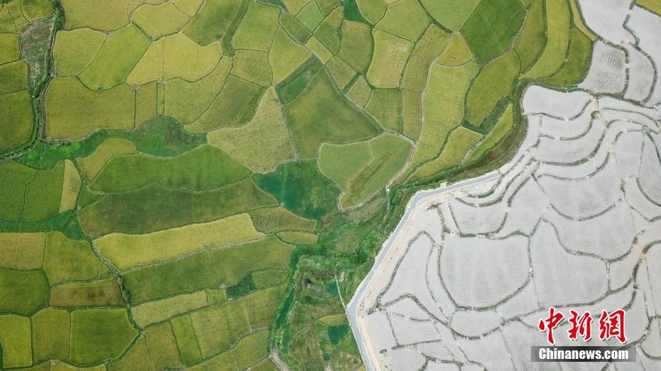9月3日,航拍贵州省黔东南苗族侗族自治州天柱县稻田秋色,呈现一幅醉人初秋画卷。中新社记者 瞿宏伦 摄