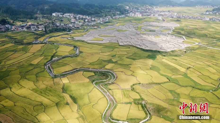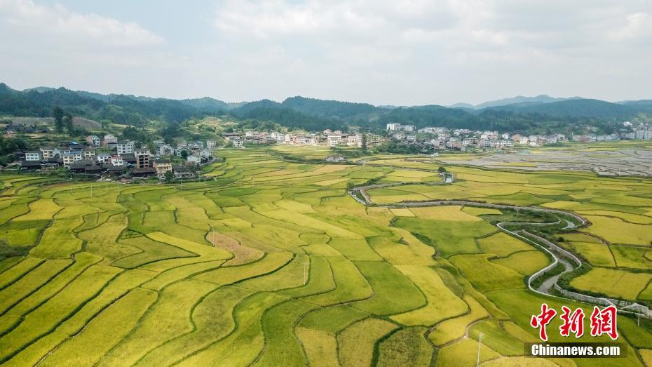 9月3日,航拍贵州省黔东南苗族侗族自治州天柱县稻田秋色,呈现一幅醉人初秋画卷。中新社记者 瞿宏伦 摄