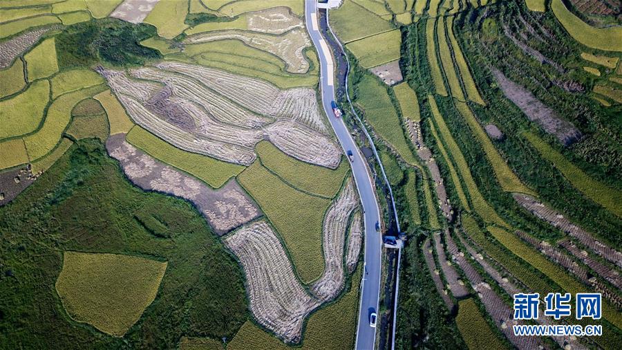 汽车行驶在湖南湘西花垣县麻栗场镇沙科村的公路上(9月4日无人机拍摄)。 近日,湖南湘西土家族苗族自治州花垣县麻栗场镇沙科村的稻田陆续变黄,层层叠叠的梯田、蜿蜒迂回的田坎和错落有致的苗寨相映成趣。 新华社记者 陈泽国 摄