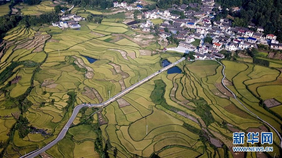 空中俯瞰湖南湘西花垣县麻栗场镇沙科村的稻田(9月4日无人机拍摄)。 近日,湖南湘西土家族苗族自治州花垣县麻栗场镇沙科村的稻田陆续变黄,层层叠叠的梯田、蜿蜒迂回的田坎和错落有致的苗寨相映成趣。 新华社记者 陈泽国 摄