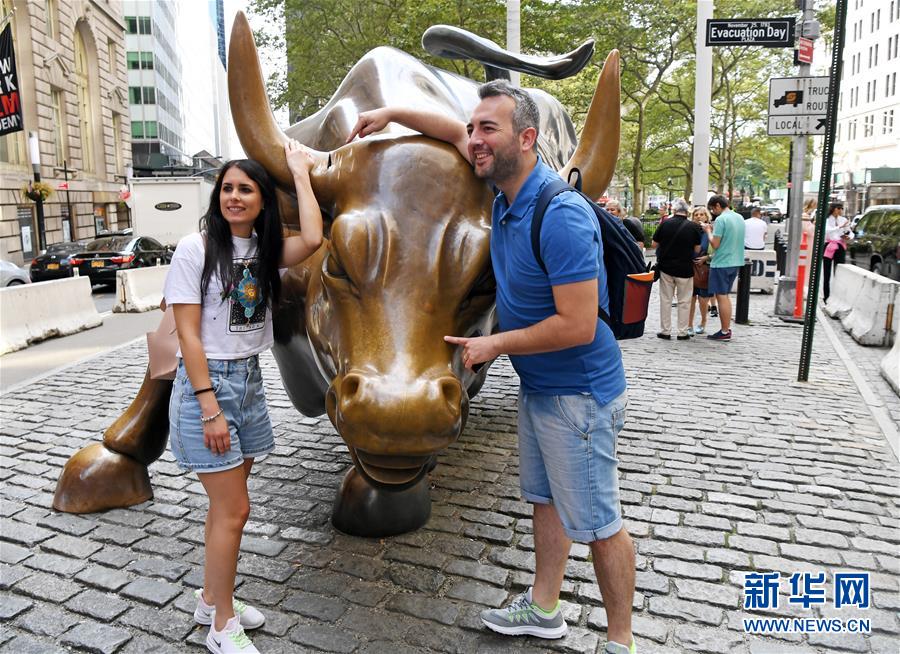 9月9日,在美国纽约,游客在华尔街铜牛前留影。