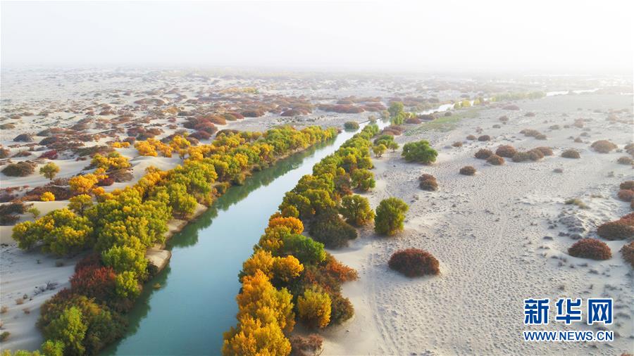 生态水滋养着新疆塔里木河下游河道两岸的胡杨,阻止了塔克拉玛干与库姆塔格两大沙漠合拢(2017年10月15日无人机拍摄)。 新华社发(肖玉磊 摄)