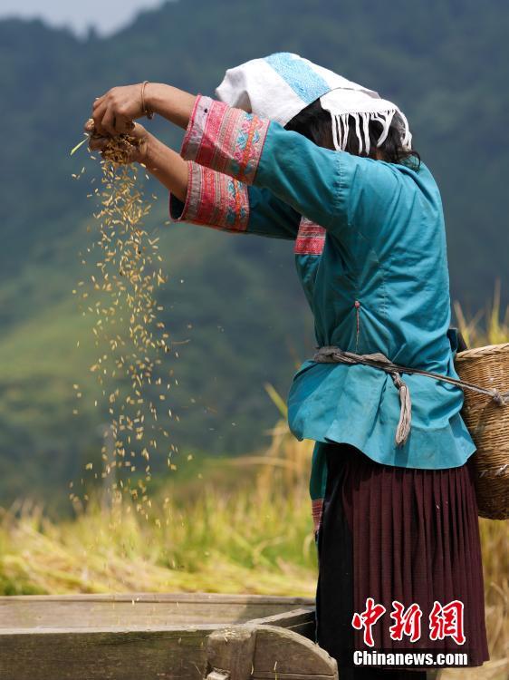 9月17日,贵州省榕江县阳开梯田,一位苗族妇女在田间筛稻谷。金秋时节,贵州各地进入秋收繁忙时节,民众抢抓农时,喜迎丰收。中新社记者 贺俊怡 摄