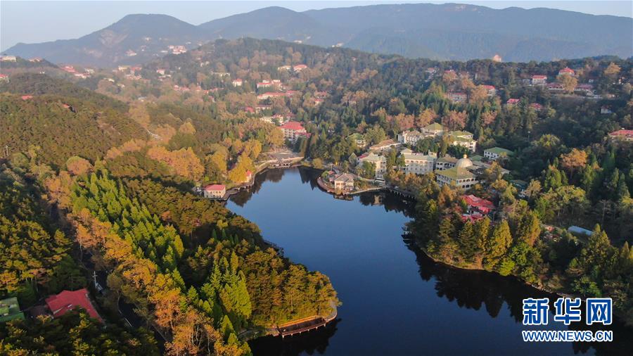 这是10月9日在庐山风景区拍摄的如琴湖(无人机拍摄)。 金秋时节,江西省庐山风景区层林尽染,景色如画。 新华社记者 胡晨欢 摄
