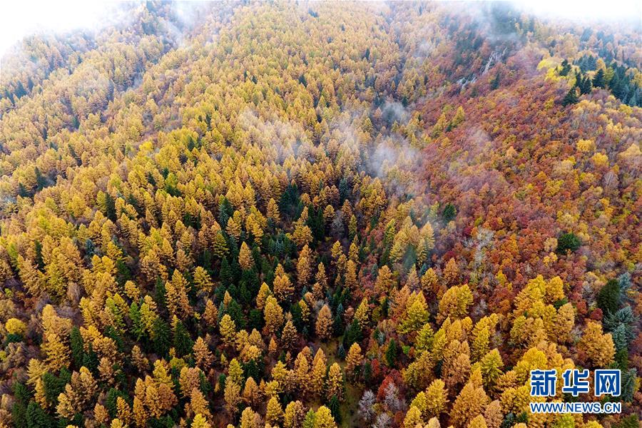 这是10月16日无人机拍摄的山西庞泉沟国家级自然保护区。 当日,雨后的山西庞泉沟国家级自然保护区云雾缭绕,景色迷人。庞泉沟国家级自然保护区位于山西省交城县和方山县交界处,森林覆盖率高达74%,是黄土高原上难得的绿洲,有“华北绿肺”之称。 新华社记者 詹彦 摄