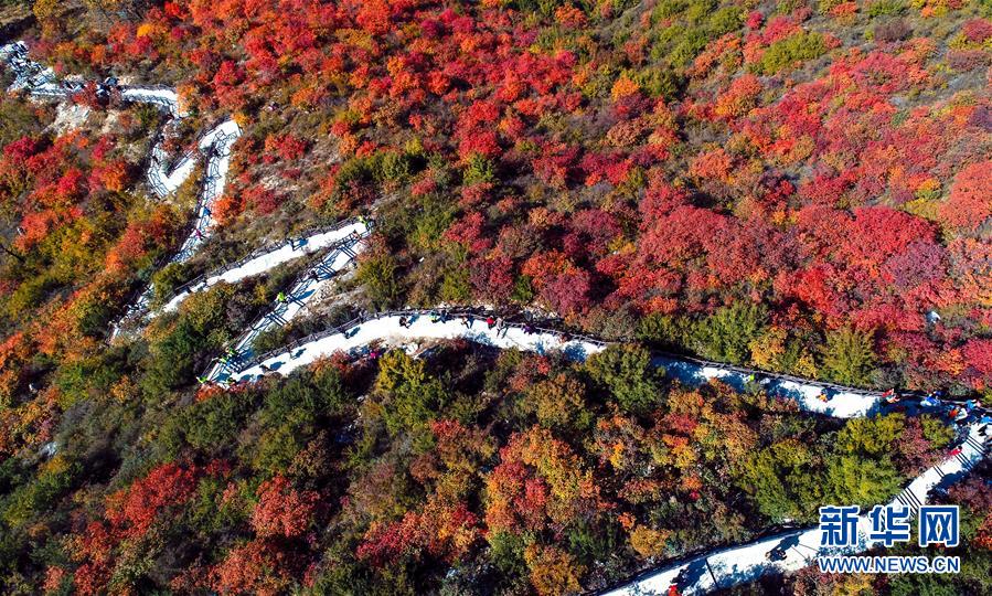 这是10月19日无人机拍摄的河北省涉县太行红叶大峡谷景色。 金秋十月,河北省涉县偏城镇太行红叶大峡谷的红叶进入观赏佳期,吸引众多游客前来登山赏景。 新华社记者 王晓 摄