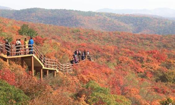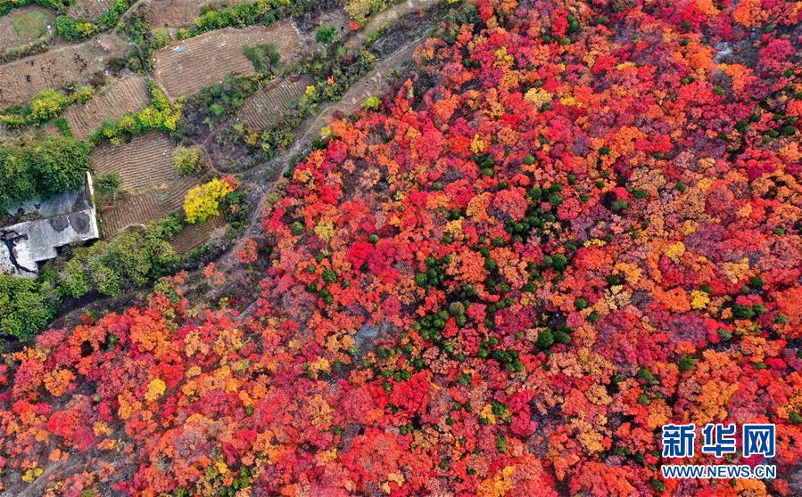 济南蝎子山上火红的黄栌树林(11月4日无人机拍摄)。 日前,位于山东济南市的蝎子山以山脊为分界线,形成了“一山双色”景观,令人称奇。据了解,蝎子山山体南侧种植着2万多平方米的黄栌树,而在山体的北侧是松树林,所以每到秋冬交替时节,便出现了半边青翠半边红的景象。 新华社记者 朱峥 摄